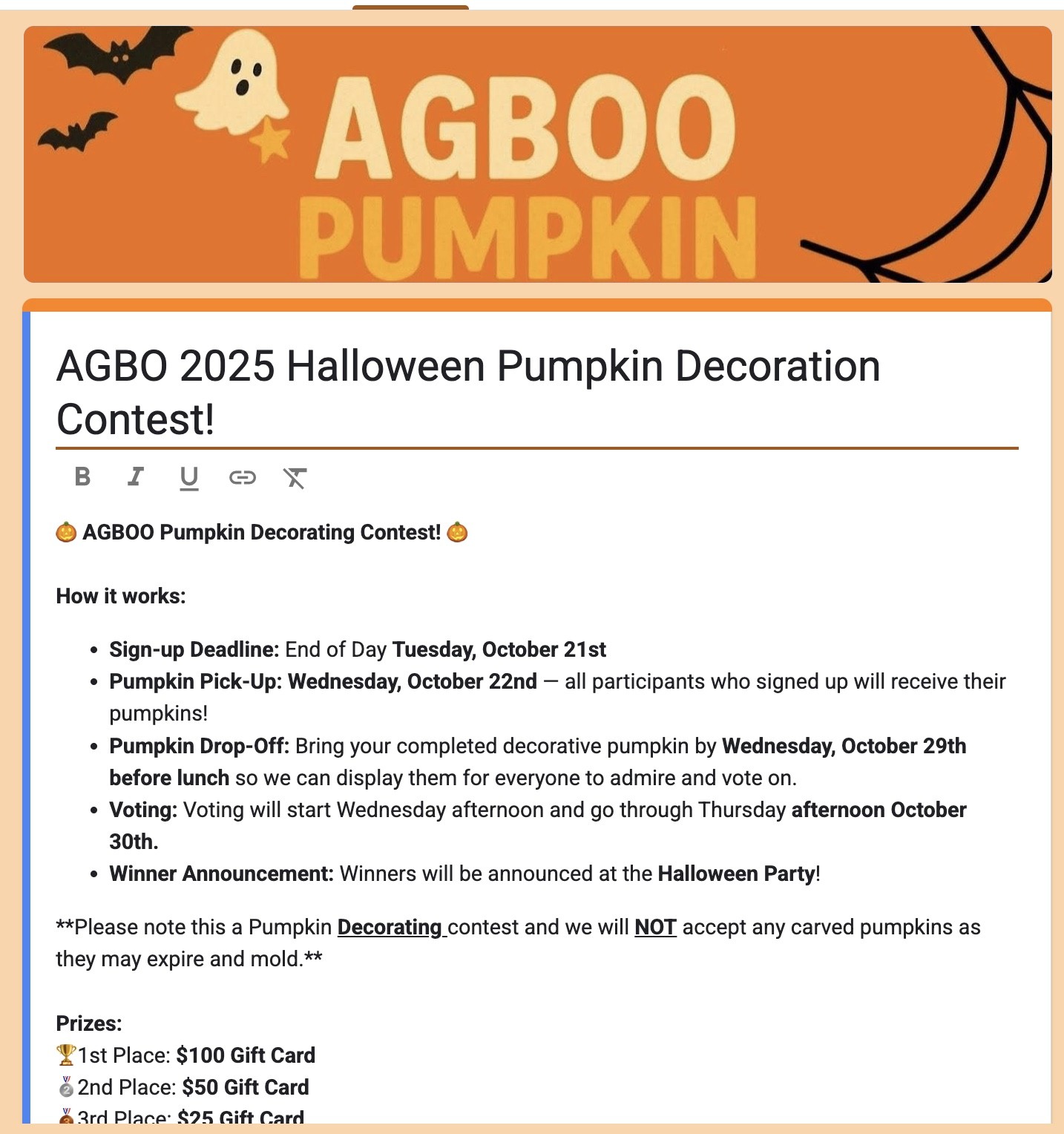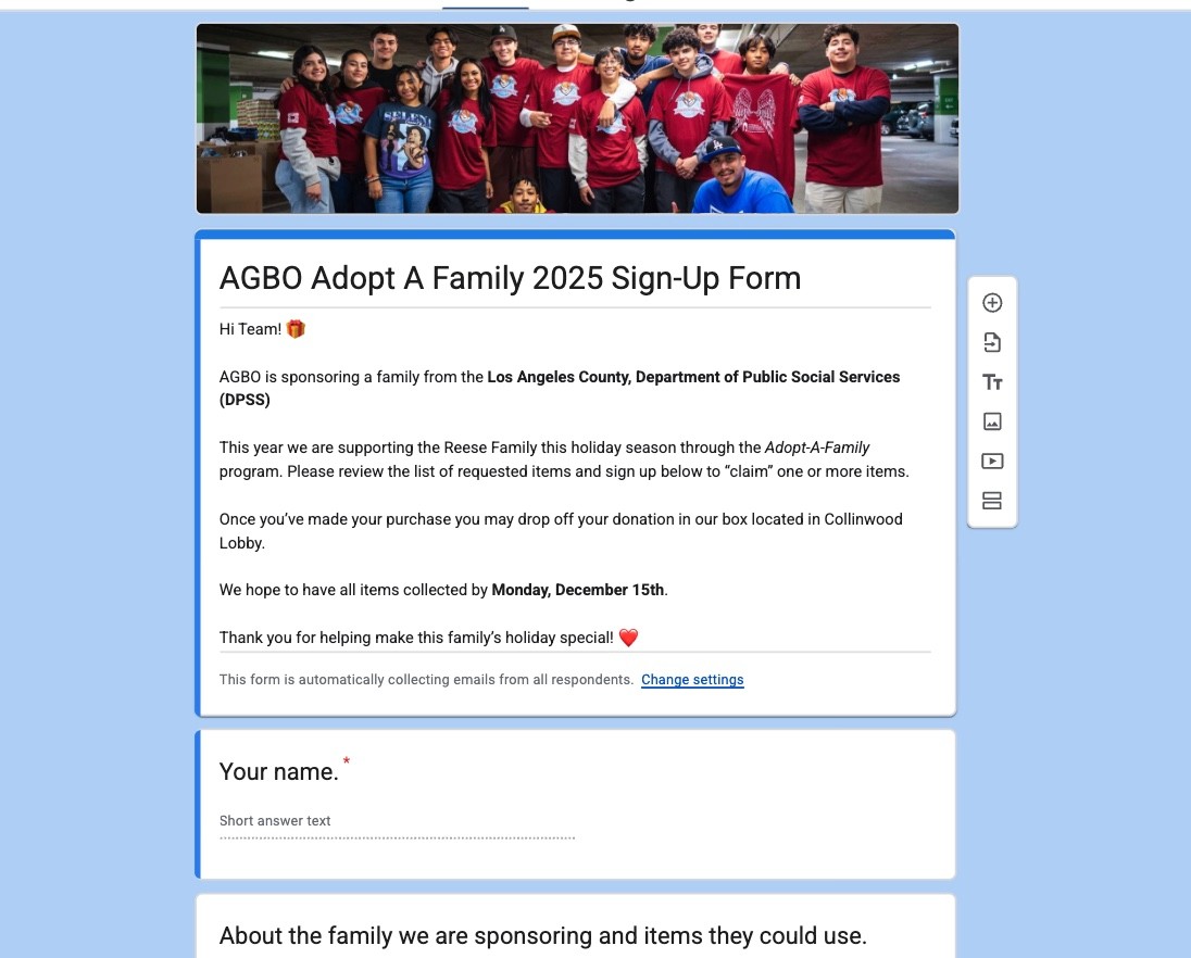 To streamline participation across AGBO’s internal and community-driven initiatives, I created a comprehensive library of digital sign-up forms and tracking systems. These forms support everything from community engagement events to in office programs ensuring organization-wide accessibility, clarity, and data accuracy. I’ve developed registration systems for AGBO’s 5K Runs, Halloween pumpkin decorating contests, Oscar prediction pools, Adopt a family Christmas, and Holiday cultural events.