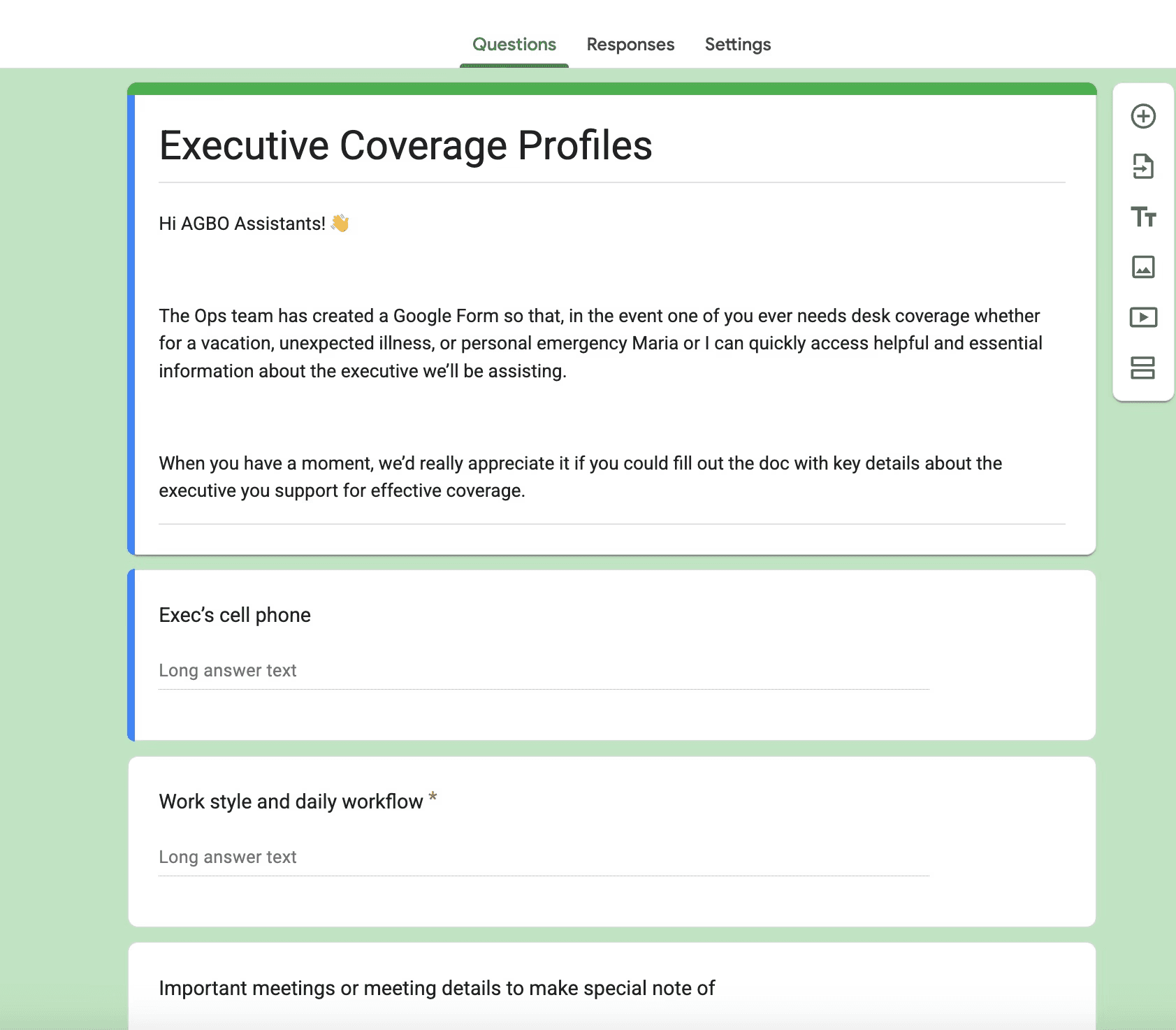 Creating structured coverage templates that capture essential executive information, enabling seamless support transitions between administrative staff.