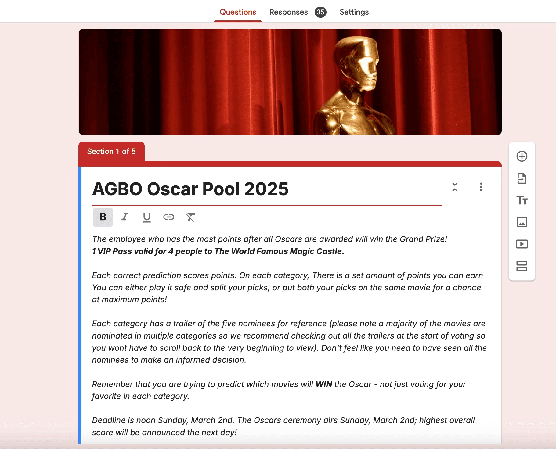 Designing creative and morale-driven internal surveys and sign-up systems — from Oscar prediction ballots to holiday contests and company playlist submissions.